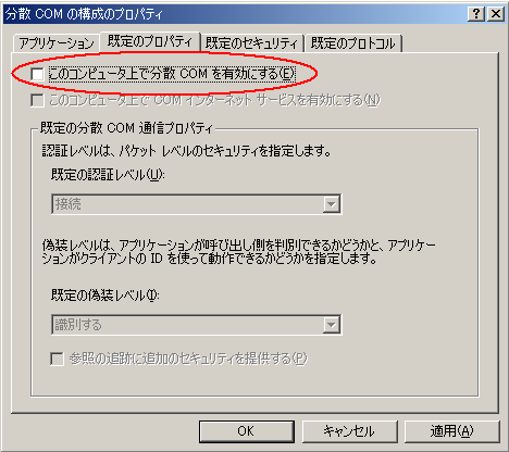 チェックを外した後で、[適用] をクリックし、さらに [OK] をクリックします。 「分散 COM の構成のプロパティ」ウィンドウが閉じます。