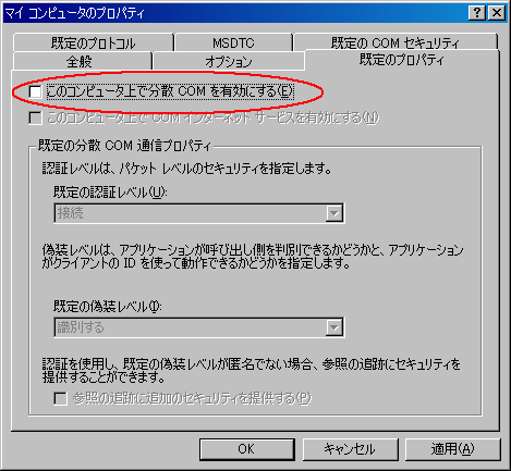 すると「マイ コンピュータのプロパティ」ウィンドウが表示されます。 [既定のプロパティ] タブの [このコンピュータで分散 COM を有効にする] のチェックを外します。